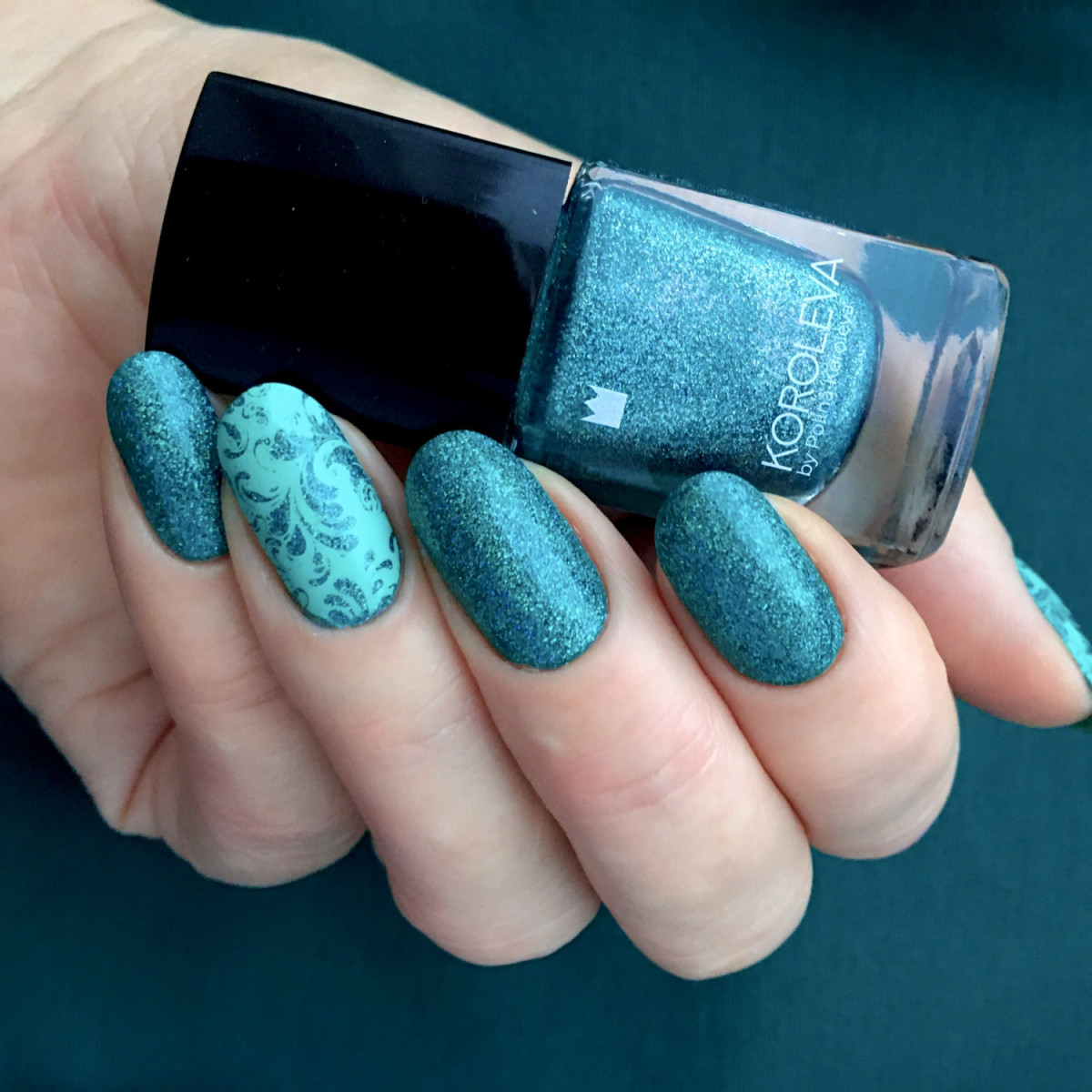 Послушный двухслойник. Основной цвет - очень тёмный тил. На магнит реагирует хорошо, блик собирается шустро и красиво. Можно уложить вторым слоем на околочёрную подложку (у меня был OPI Holidazed Over You). С топом дружит. Отличник!