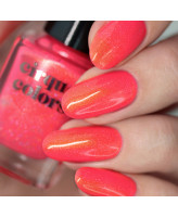 То ли желе, то ли креле - в два слоя лак мне показался всё ещё прозрачным, на фото у меня три слоя и топ. У лака тёплая зелёная полупрозрачная база и красно-оранжевый шиммер (в тени получается преимущественно зелёный со слабым рыженьким бликом, зато как только лак попадает на свет, шиммер загорается). Ещё в замесе есть немного голографической крошки, её видно на солнышке и при ярком свете (но у меня на фото получилось поймать только в расфокусе).