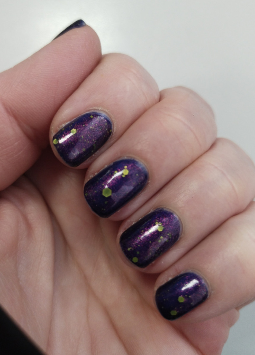 В три слоя только приближение к тому, что во флаконе, с синим подтоном, в один - синее прозрачное, четвёртый слой я не рискнула, хотя очень хотела именно густой чистый фиолет, как на свотчах. Всё равно красиво и будет носиться, но того, на что я запала, нет, увы. Попробую нижним слоем подложить чистый фиолет (их есть у меня), но не уверена в результате.
