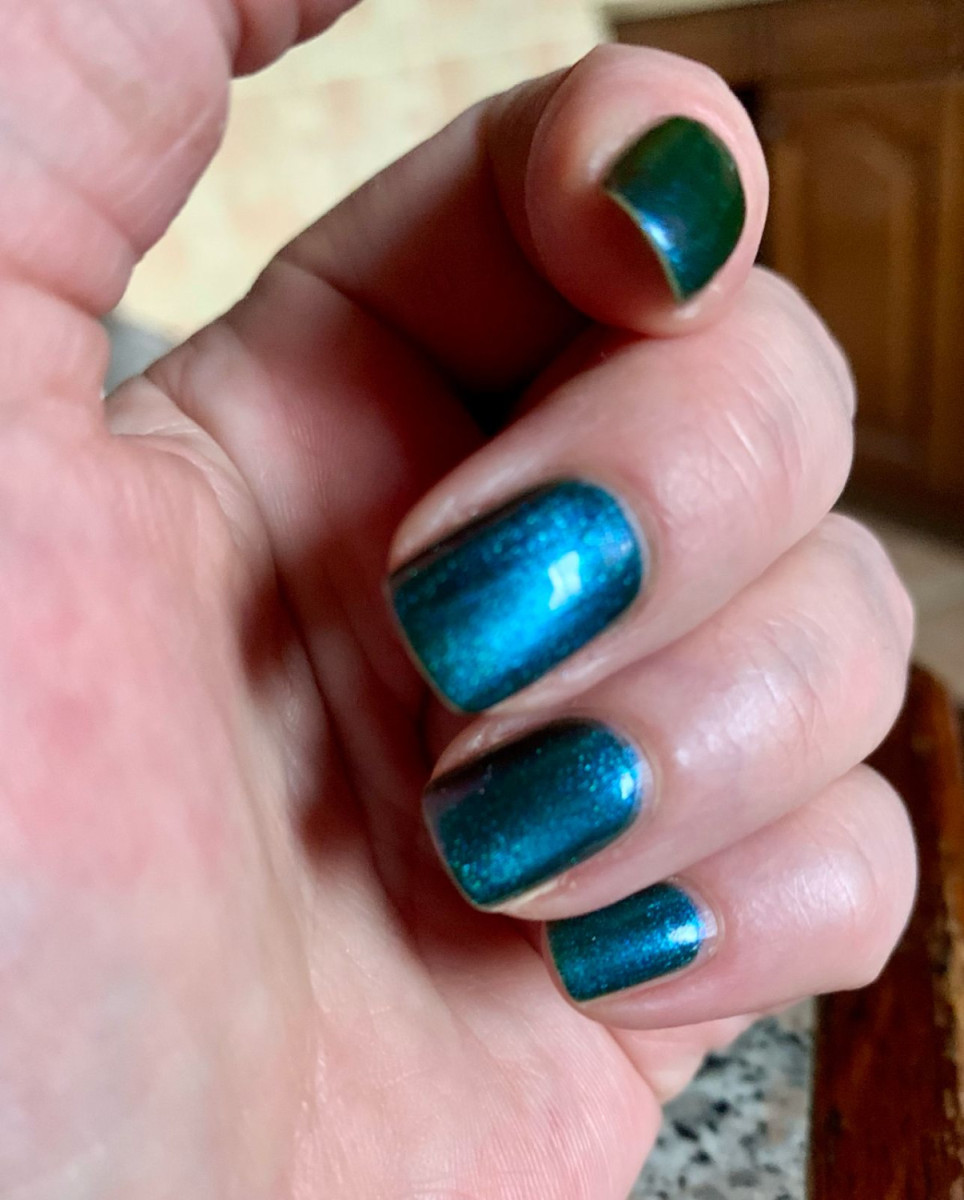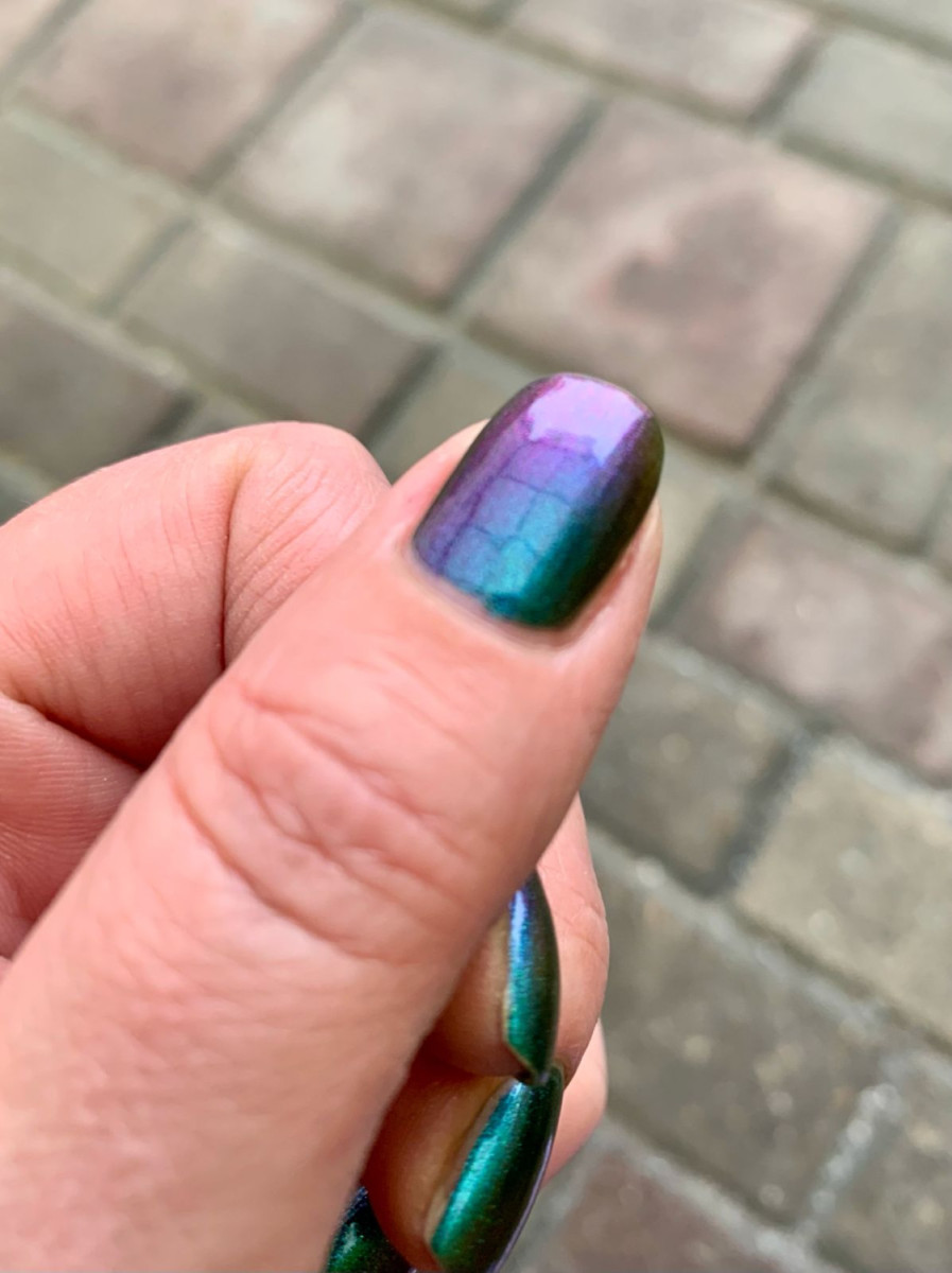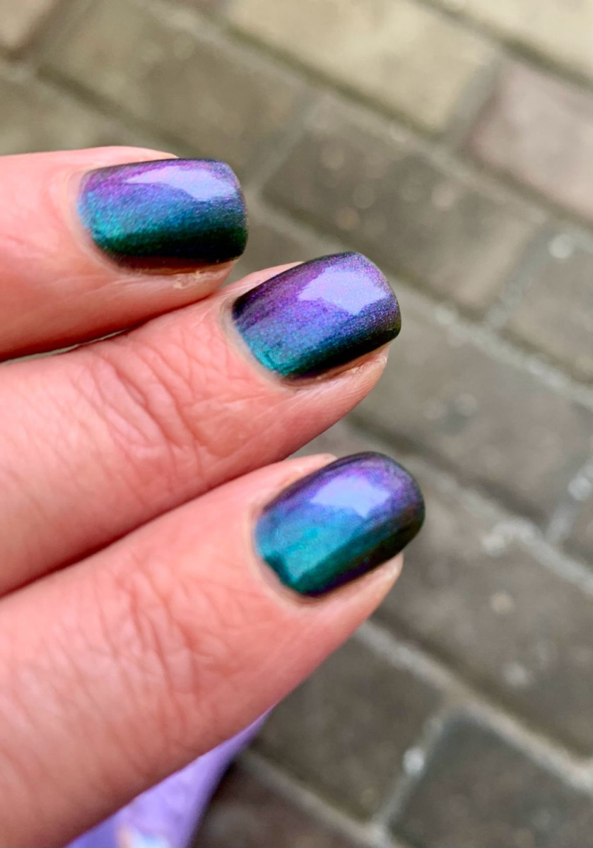 Дуохром и магнит в одном флаконе, переливчатый аки павлиний хвост. Укладывается очень легко, магнитится шустро. Достаточно двух слоёв. Держится прекрасно, до снятия, без сколов и трещин.