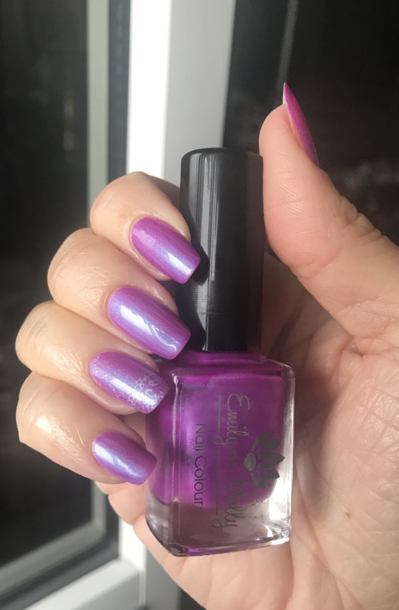 Один из наикрасивейших лаков! Яркий, цвета фуксии с голубым шиммером, хорошо видимым и в тени, и на солнце. Отличные ТХ. Финиш матовый, нужен топ для глянца и глубины цвета. Обалденно красивый, постоянно любуешься на руки!