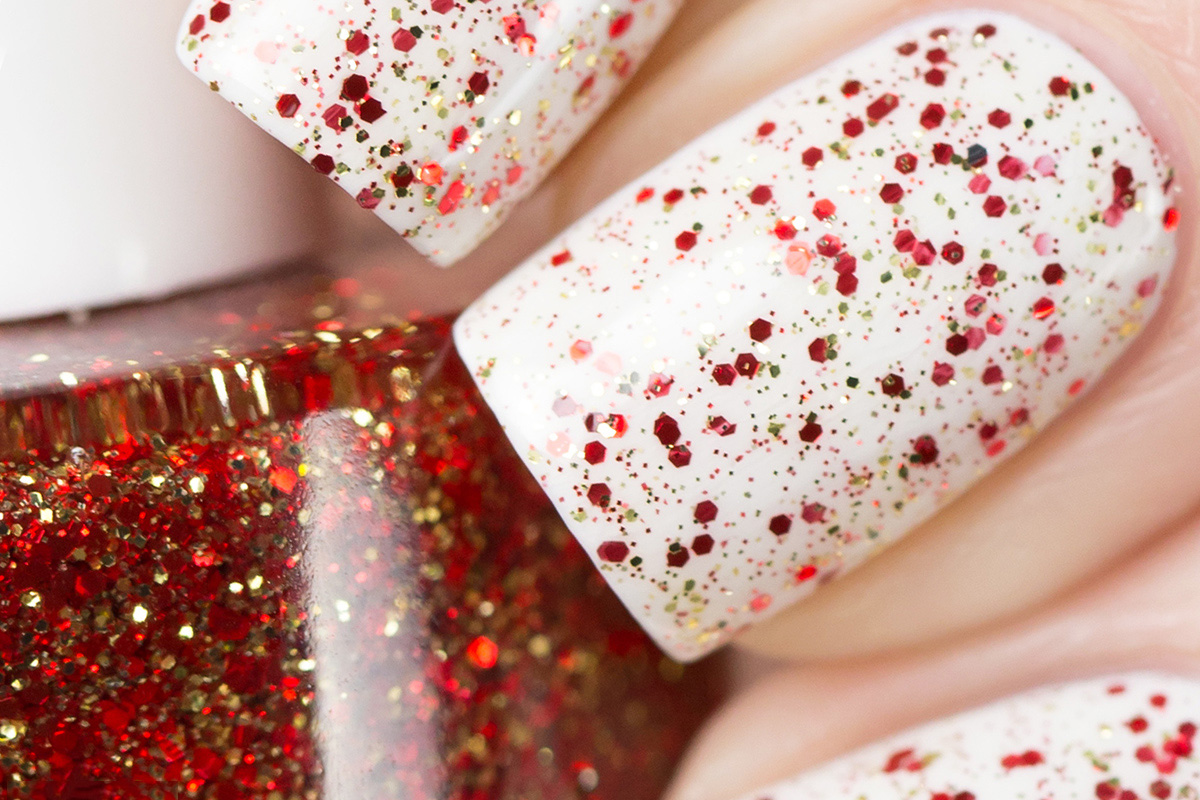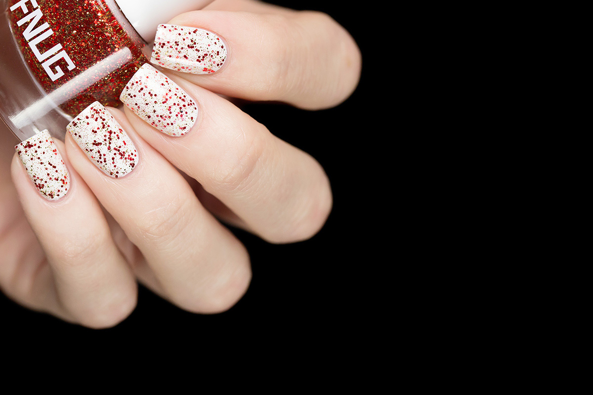 | Особенности поведения | на фото нанесен в 1 слой поверх белого лака и покрыт топом. Для более легкого снятия глиттерных лаков рекомендуется наносить их на специальную Peel Off базу. |