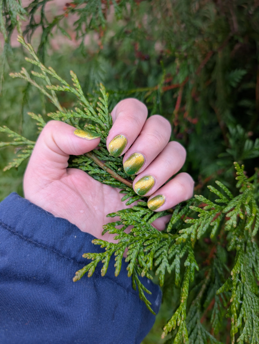 Уверенно держит блик, нанесла один тонкий слой, потом, уже на магните, слой пожирнее, а затем - сушку (тоже не снимая палец с магнита). На третий день начали затираться кончики, сколов не наблюдаю. Переливы завораживают, постоянно на них отвлекаюсь 😄
