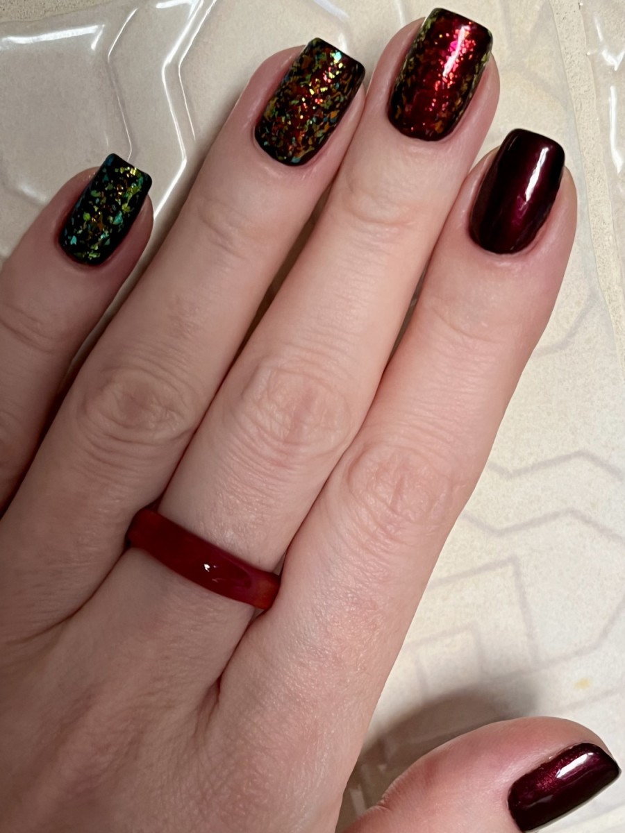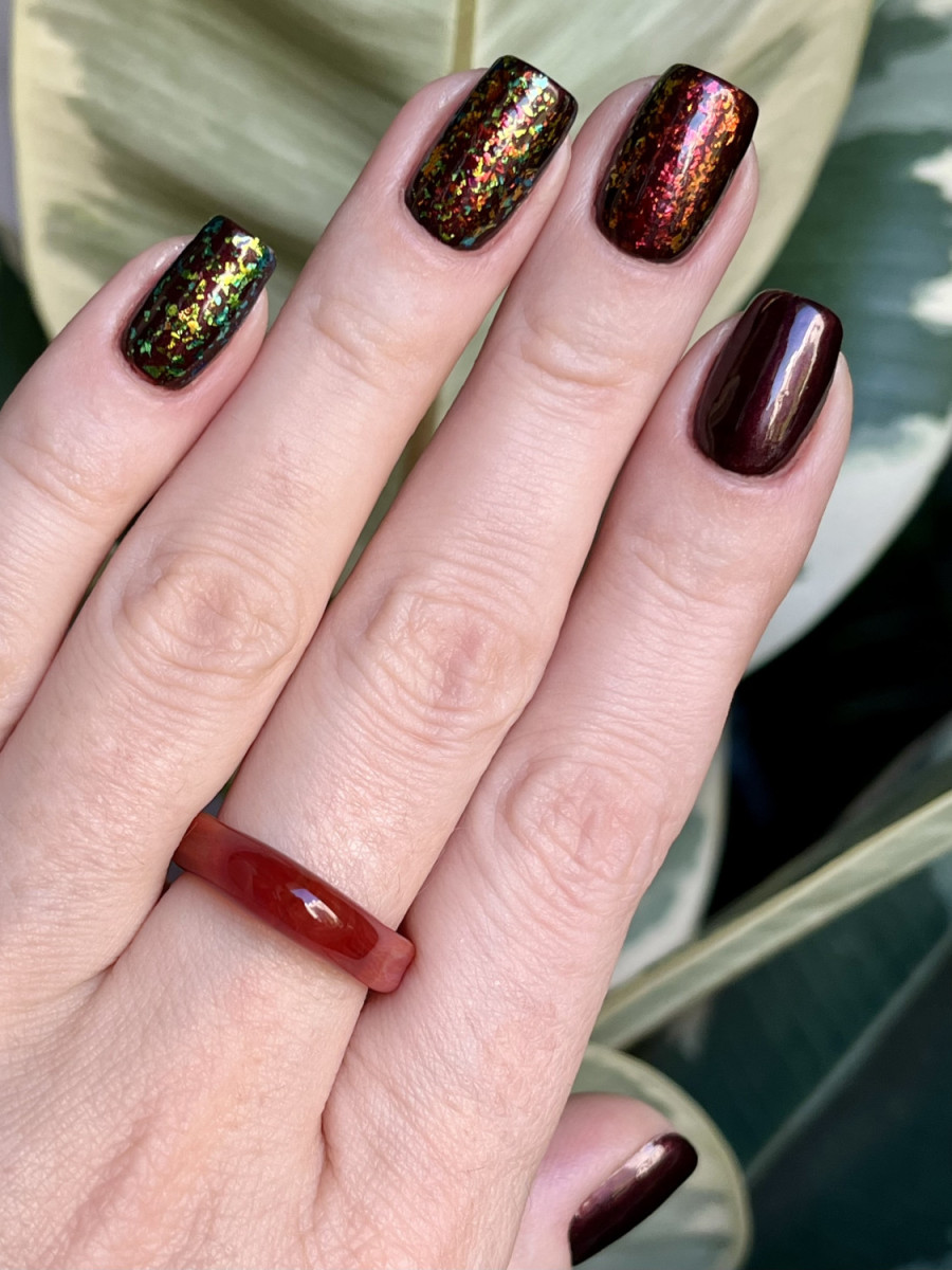 Потрясающе красивый лак! При любом повороте руки горит огнем, в плане подложек универсален, украсит собой почти любой лак) Хлопья оказались немного мельче, чем ожидала, но я все равно в восторге)