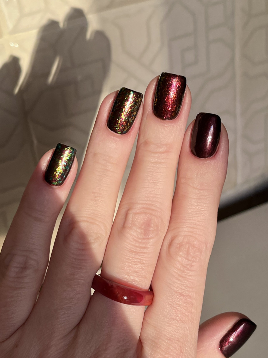Очень красивый лак! Первый раз носила его осенью, кажется россыпью листьев на ногтях. Наносила один слой на чёрную подложку, наносится равномерно, покрытие неплотное. Переливы цвета видны, по-моему, при любом освещении и малейшем движении руки. Отдельно хочется сказать про то, с какой лёгкостью лак снимается. Хлопья просто растворяются под ждсл и в итоге нет никаких проблем. Однозначно возьму ещё лаки из этой серии, безумно классные!