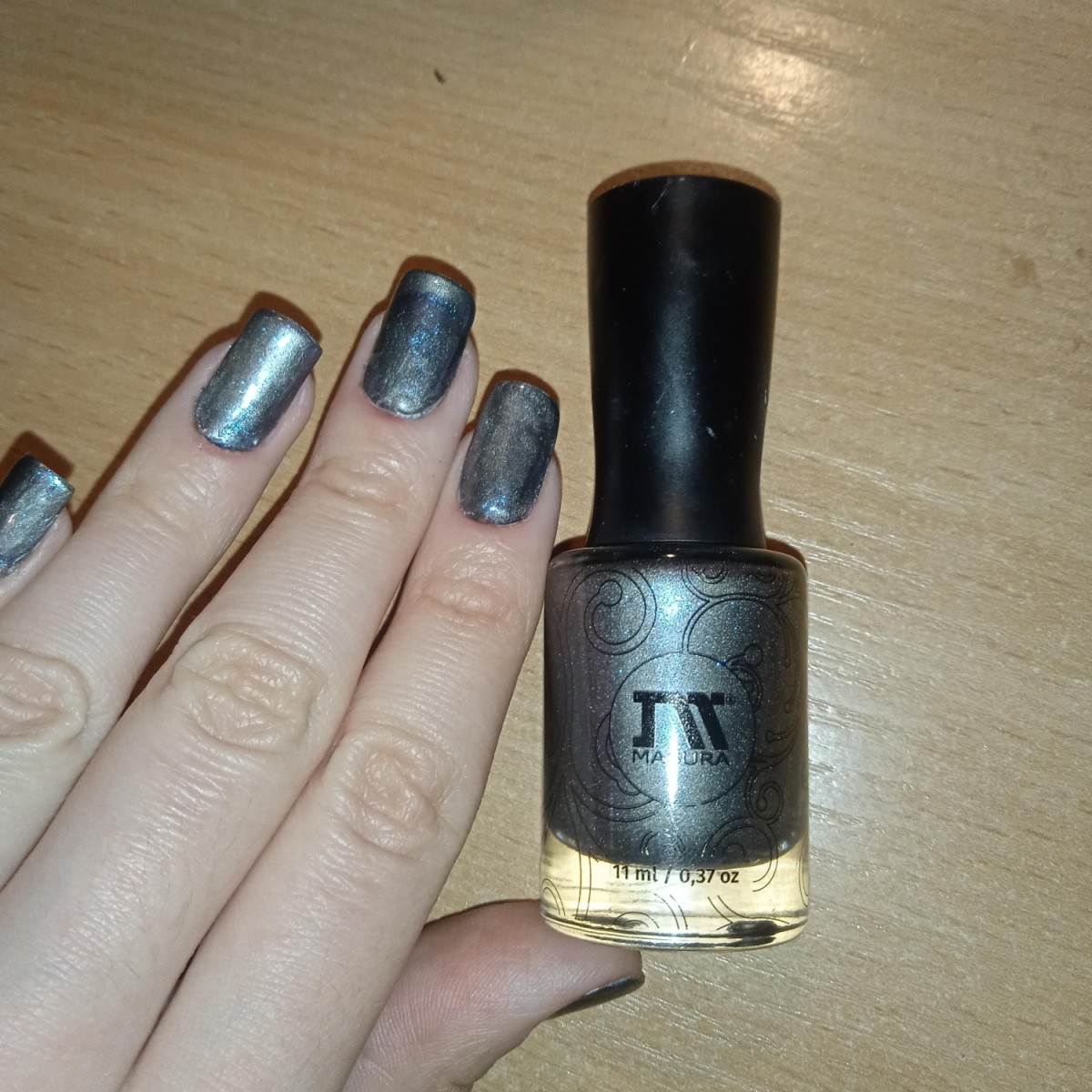 Давно лежал, все руки не доходили. Понравился цвет, интересные переходы от серого к сине-черному. Но густой! Пришлось разбавлять. Магнитила второй слой и через топ. Через топ даже лучше вышло, на некоторых ногтях лак лег как-то интересно, с завихрением)) возможно, это от неровности ногтя. Сохнет средне, может стягиваться топом. Я всегда магнитные лаки пробую на стемпинг, и этот раз не исключение. Переводит рисунки без проблем, нужна только контрастная подложка, рисунок лучше смотрится. У меня получилась мерцающая дымка, которая видна под определенным углом. Балл сниму за густоту и необходимость разбавления и стягивание.